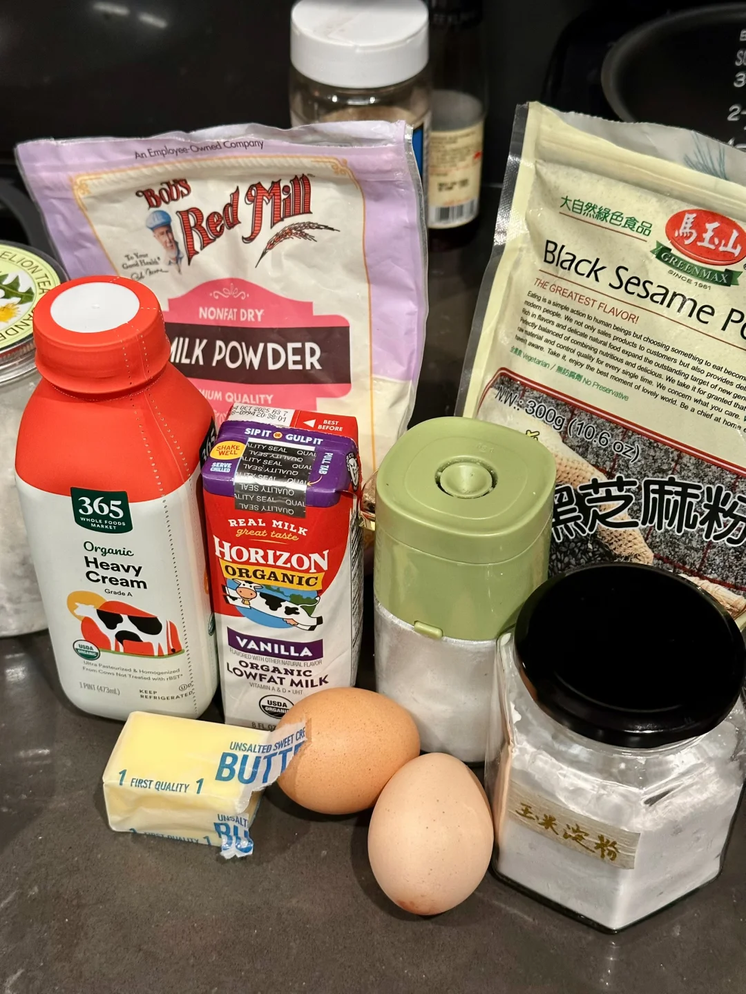 鸡蛋两个,白糖40g,牛奶80g、奶油40g,黄油30g,玉米淀粉40g,面粉40g,黑芝麻粉50g