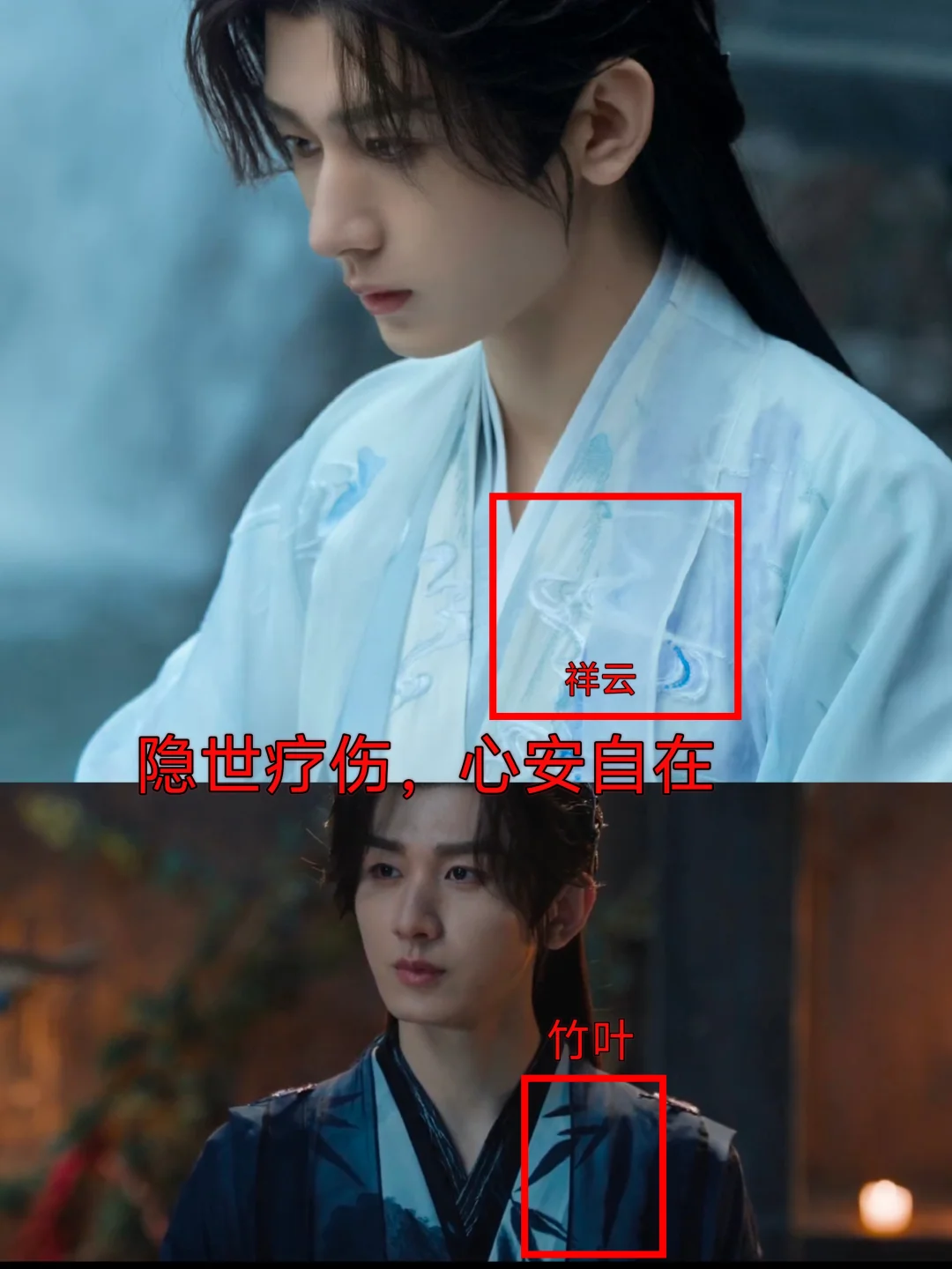 🎋在与小蜘蛛避世生活时,他头上不带发饰,衣服上也是云朵、竹叶的隐士纹样,此处便是心安之所。