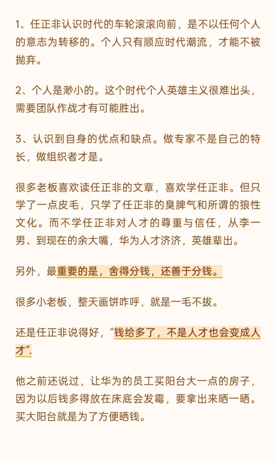 任正非强调个人无法赶上时代,需组织团队才能与之同步。 他不再追求专家地位,转而成为组织者,强调发挥各路英雄的作用。 同时,任正非尊重人才,善于分钱,鼓励员工合理理财,展现其对人性的深刻洞察与管理智慧。