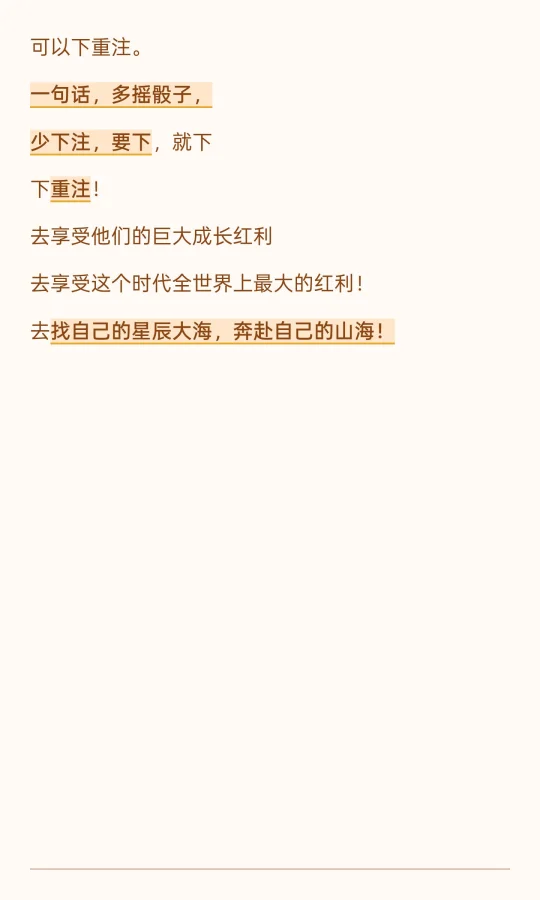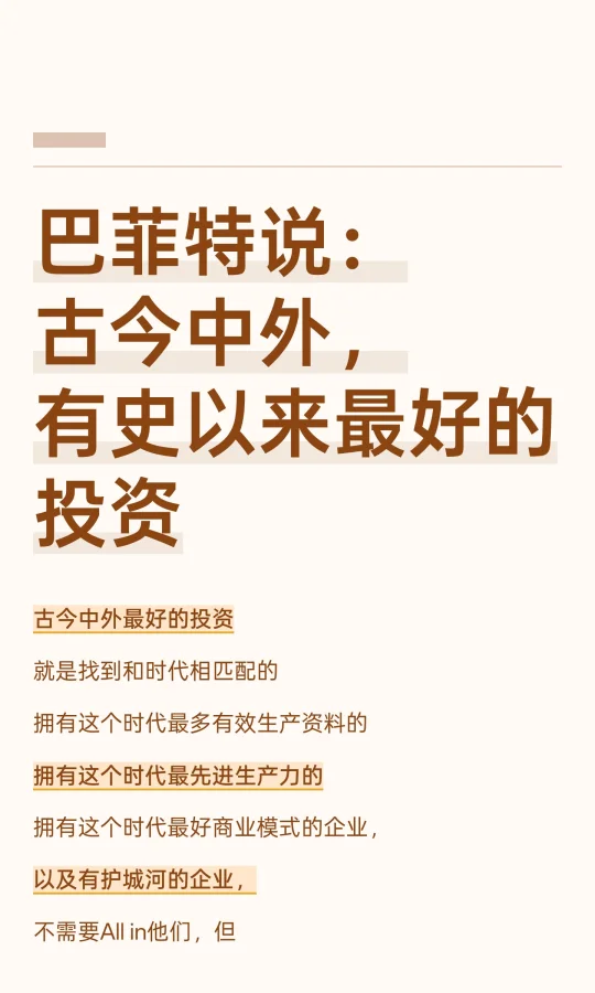 投资应选择与时代匹配、拥有先进生产力和最佳商业模式的企业,尤其是那些具备护城河的企业。 虽然需要谨慎选择,但一旦发现,应果断投入大量资金,享受其成长红利,抓住全球最大的投资机会。 一句话,长期持有,慢慢变富!