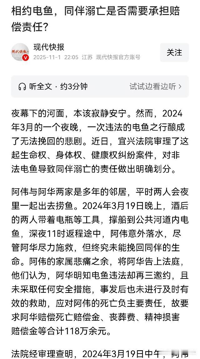 江苏宜兴,阿华和阿伟相约一起去电鱼,返程途中阿伟意外落水溺亡,阿伟家属认为,阿华明知道电鱼违法还再三邀约,还未采取任何安全防护措施,于是起诉阿华索赔118万余元。 阿伟和阿华是打小住对门的邻居,两家隔得不远,平时端着碗都能凑一块吃饭。 这俩人从小一块长大,有个共同爱好,就是夜里扛着网兜去河里捞鱼,说是野生的鱼鲜,比菜市场买的香。 2024年3月19号中午,阿伟蹲在阿华家院门口修自行车,抬头瞅见阿华正蹲在门槛上择菜,就扯着嗓子喊:晚上咱去河里弄点鱼,改善改善伙食。 阿华当时正忙着准备晚上的饭局,头都没抬说:今晚不行,约了几个老同学喝酒。 晚上七点刚过,阿华家电话突然响个不停。接起来一听是阿伟,电话那头声音有点含糊:华子,出来呗,我都把网兜准备好了。 阿华推说喝多了头晕,可阿伟不依不饶,一连打了八个电话,最后阿华架不住软磨硬泡,答应九点出门。 九点整,阿伟蹬着三轮车来了,车斗里堆着电瓶、抄网,还有两套防水裤。阿华闻到他身上有酒味,皱着眉头说:你喝酒了? 阿伟拍着胸脯说:就两杯啤酒,没事。两人把工具搬上阿华家那条旧木船。 这条河是公共河道,平时有渔政巡逻。两人划到河中心时,阿伟把电瓶接上电线,金属杆往水里一戳,顿时泛起一片蓝火花。 二人返程时已经十一点,船还没到闸口,阿伟说怕被人发现,突然伸手把头灯关了。阿华还没反应过来,就听见扑通一声,接着是阿伟在水里扑腾的声音。 阿华手忙脚乱摸到开关,头灯亮起时,只见阿伟在水里沉浮,两只手乱抓。 阿华扑到船边,到处寻找阿伟,可船头上已经看不见阿伟的影子了。阿华慌里慌张用篙子将船固定好,打了报警电话,并不停用工具去水里打捞。 可忙活了半天,阿伟就像消失了一样,根本连影子也没碰到。 最终,在救援队和村民的帮助下,阿伟被捞了上来,可他早就没有生命体征了。 阿伟家属赶到现场后,哭得直不起腰。他们认为,阿华明知道电鱼是违法的,还经常叫阿伟去捕鱼,这次明知道他喝酒了还拉他去,阿华应该负责。 这起案件中阿华作为共同参与者,在明知阿伟饮酒的情况下仍邀约其参与危险活动,是否构成过失致人死亡罪? 根据《刑法》第二百三十三条,过失致人死亡的,处三年以上七年以下有期徒刑;情节较轻的,处三年以下有期徒刑。 阿华虽明知阿伟饮酒仍应邀参与电鱼,但过失致人死亡罪要求行为人应当预见自己的行为可能发生危害社会的结果,因为疏忽大意而没有预见,或者已经预见而轻信能够避免。 阿华应阿伟的约电鱼,虽有一定过错,但难以认定其达到过失致人死亡罪中“应当预见危害结果发生”的程度,更多是民事侵权层面,所以不构成该罪。 河道管理部门在此事中是否存在责任? 《民法典》第一千一百九十八条,公共场所的管理人,未尽到安全保障义务,造成他人损害的,应当承担侵权责任。 案发河道是公共水域,管理部门主要职责是维护水域正常秩序、监管非法捕捞等,对电鱼这种个人危险行为,难以认定其有直接安全保障义务,所以阿伟家属难以据此向河道管理部门索赔。 法院审理时,调取了两人的通话记录。阿伟家属提供证据显示,阿伟当天中午喝了半斤白酒,晚上又喝了三瓶啤酒。 渔政部门出具的报告显示,那台电鱼器电压超过安全标准,船底朽木存在严重安全隐患。 经审理认为,阿伟作为完全民事行为能力人,明知酒后不能从事危险作业,仍主动参与电鱼且操作不当,承担主要责任。 阿华作为共同参与者,明知对方饮酒仍邀约,且未对设备安全检查,承担次要责任,最终,判决阿华赔偿312020.9元。 一审判决后,阿伟家属和阿华均不服上诉,二审维持原判。 来源:现代快报