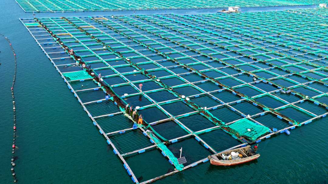11月1日,山东省荣成市石岛管理区桑沟湾国家级海洋牧场,工人进行海参收获作业。