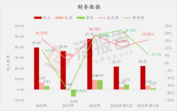 收入分别约为人民币39.52亿、35.96亿、47.76亿、21.57亿、22.21亿,2025年前6月同比+2.98%;