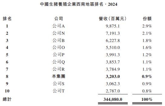 按单猪毛利计,公司在中国规模化生猪养殖企业中排名第二。按营收计,公司在中国西南地区生猪养殖企业中排名第八。