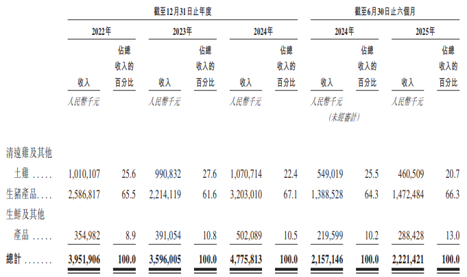 公司提供全面的产品组合,主要包括清远鸡及其他土鸡、生猪产品以及生鲜及其他产品。公司的清远鸡为国家级保护的优质特色本土鸡种,以肉质好和独特麻羽见称,其他土鸡亦包括岭南土鸡等。公司的生猪产品主要包括商品肉猪、种猪及哺乳仔猪。