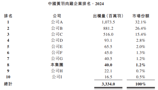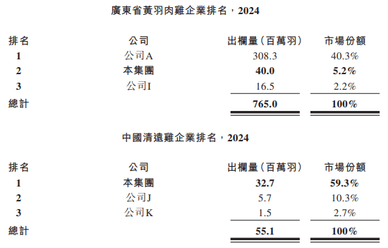 弗若斯特沙利文报告显示,按清远鸡出栏量计算,于往绩记录期间各年公司均是中国规模最大的清远鸡提供商。2024年,公司占中国清远鸡市场份额约59.3%,超过其他所有中国清远鸡提供商总和,在广东省所有黄羽肉鸡提供商中排名第二。
