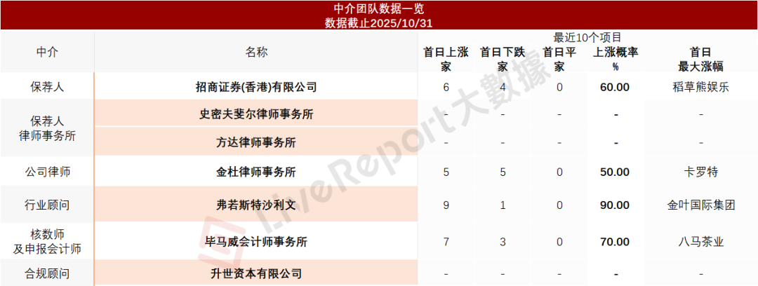 据LiveReport大数据统计,天农集团中介团队共7家,其中保荐人1家,近10家保荐项目数据表现良好;公司律师共计1家,综合项目数据表现中规中矩。整体而言中介团队表现不错。