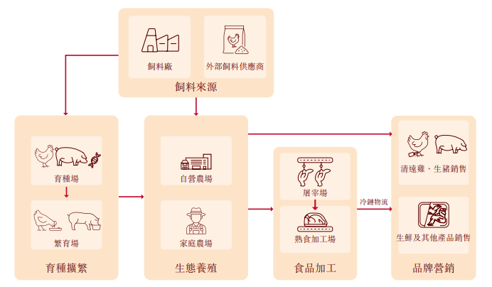 公司的商业模式覆盖了整个价值链,包括育种、良种繁育、生态养殖(通过自营农场模式和家庭农场模式)、饲料生产、屠宰、食品加工及品牌营销。