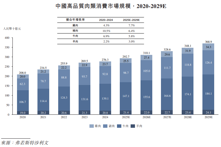 根据弗若斯特沙利文(Frost&Sullivan)的报告,中国高质量肉类消费市场规模于自2020年的人民币2,080亿元增至2024年的人民币2,763亿元,预计于2029年将达到人民币3,689亿元。