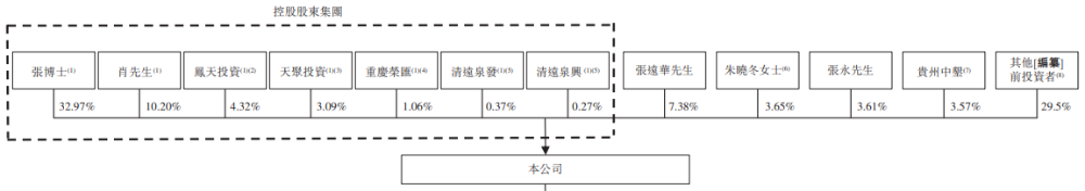 张博士直接持股32.97%,肖先生直接持股10.20%,两者控制的凤天投资、天聚投资、重庆荣汇、清远泉发、清远泉兴分别持股4.32%、3.09%、1.06%、0.37%、0.27%,两者合计持股约52.28%;