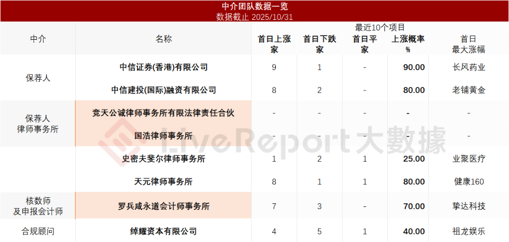 据LiveReport大数据统计,鲟龙科技中介团队共计8家,其中保荐人2家,保荐项目数据表现不错;公司律师2家,综合项目数据整体一般。整体而言中介团队历史数据整体表现一般。