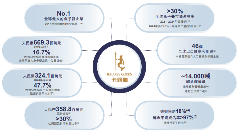 公司是全球最大的鱼子酱企业,自2015年以来连续10年实现鱼子酱销量全球第一名。2021年至2024年,公司的鱼子酱销量持续占据全球市场的30%以上,于2024年达致35.4%,超过第二大企业的5倍以上。