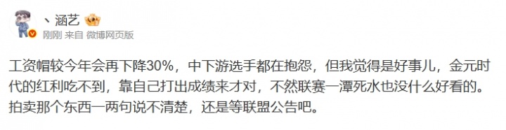直播吧11月2日讯 在今日的S15全球总决赛半决赛上,TES以0-3的比分不敌T1,赛后涵艺更博爆料称:工资帽较今年会再下降30%,中下游选手都在抱怨,但我觉得是好事儿,金元时代的红利吃不到,靠自己打出成绩来才对,不然联赛一潭死水也没什么好看的。