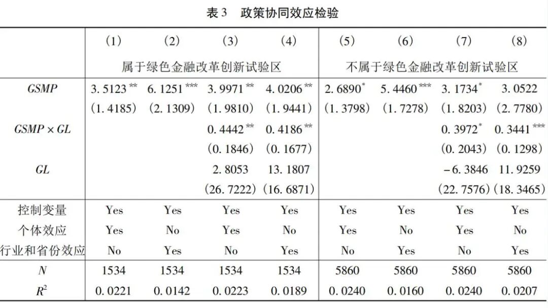按七省十地的绿色金融改革创新试验区分组估计,GSMP与GSMP×GL在试验区样本中的系数更大且更显著,表明政策协同能显著增强GSMP的投资促进与信贷传导效应(见表3)。