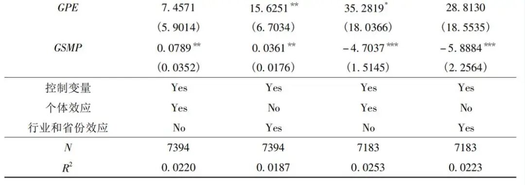 作者先估计不含交互项与含交互项两组规格,并在是否控制企业个体效应与是否改为行业×省份效应的两套固定效应设定下展示结果。核心发现为:GSMP系数在1%—5%水平显著为正,说明绿色结构性货币政策显著提升企业绿色投资;而GSMP×GL在不同规格下显著为正,表明绿色信贷占比越高,政策促进投资的边际效应越强(即政策通过信贷结构再分配渠道传导)。作者进一步以当期发生额替换余额作为GSMP稳健性指标,结论保持一致(具体估计值与显著性标注详见表1四列)。