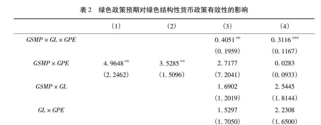 微观层面:在控制固定效应与多维控制变量后,GSMP×GPE的系数显著为正,表明预期更积极时,GSMP促进企业绿色投资的效果更强;三阶交互GSMP×GL×GPE同样显著为正,意味着积极预期能进一步提升信贷渠道的传导效率(详见表2四列中的交互项与显著性标注)。