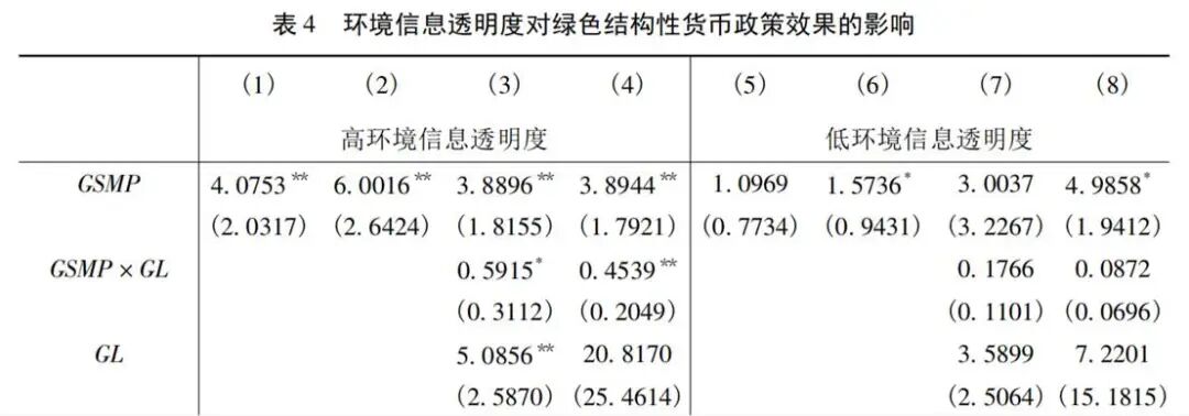 以CSMAR披露条目构造环境信息透明度指数并按中位数分组,在高透明度组中,GSMP与GSMP×GL更显著且系数更大,说明披露越充分、外部监督越强,绿色资金被更有效地投向真实绿色项目,降低“漂绿”空间,政策效果被显著放大(见表4)。