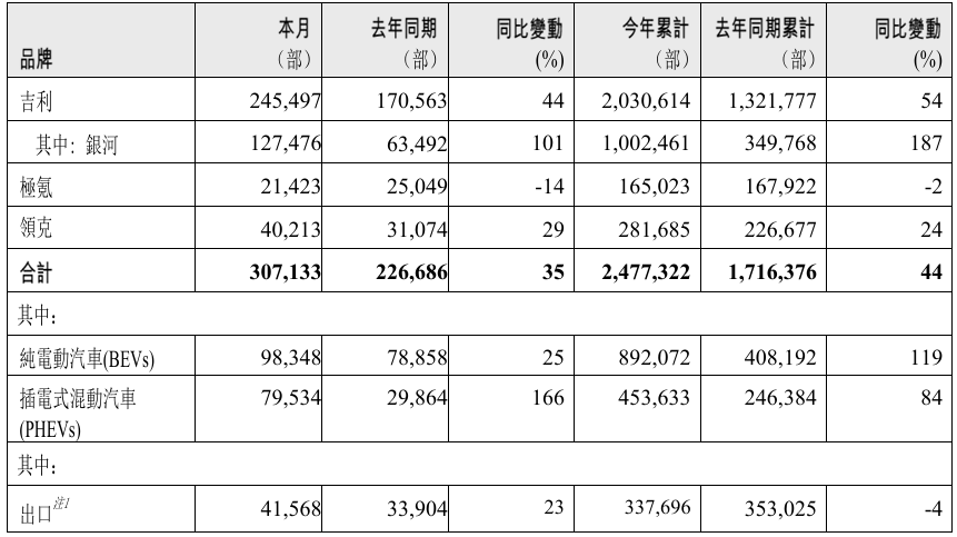 11月2日,吉利汽车(00175/80175)发布公告,本集团于2025年10月的汽车总销量为307,133部,较去年同期增长约35%。今年累计销量为2,477,322部,较去年同期增长44%。