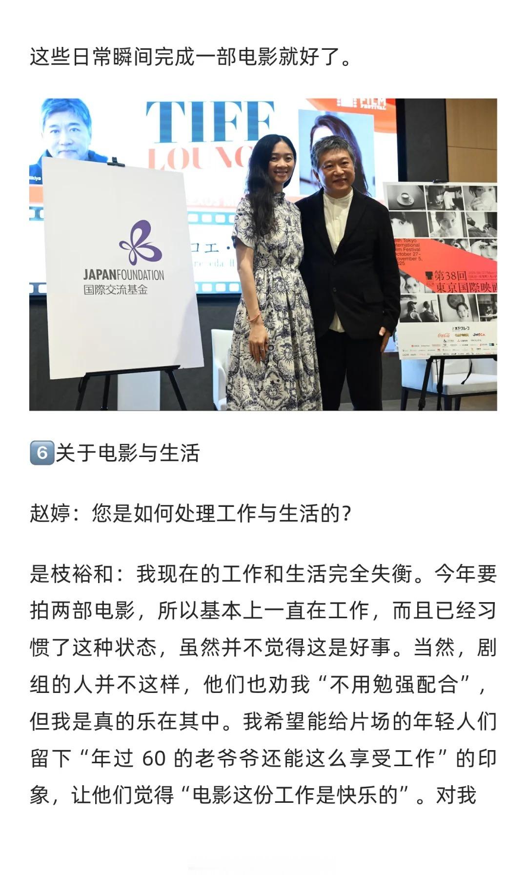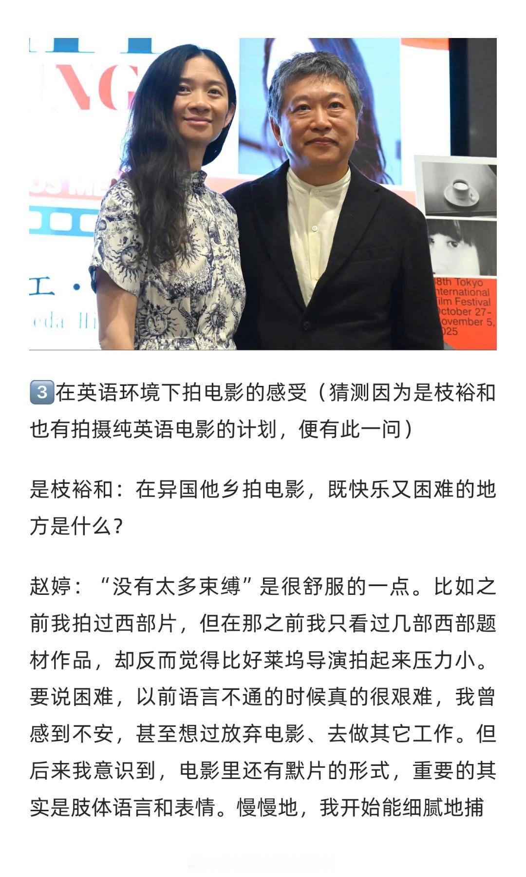东京电影节 今年东京电影节的闭幕片是赵婷的冲奥作品《哈姆奈特》,赵婷不仅现身电影节,还与知名导演是枝裕和进行了精彩的对谈。
