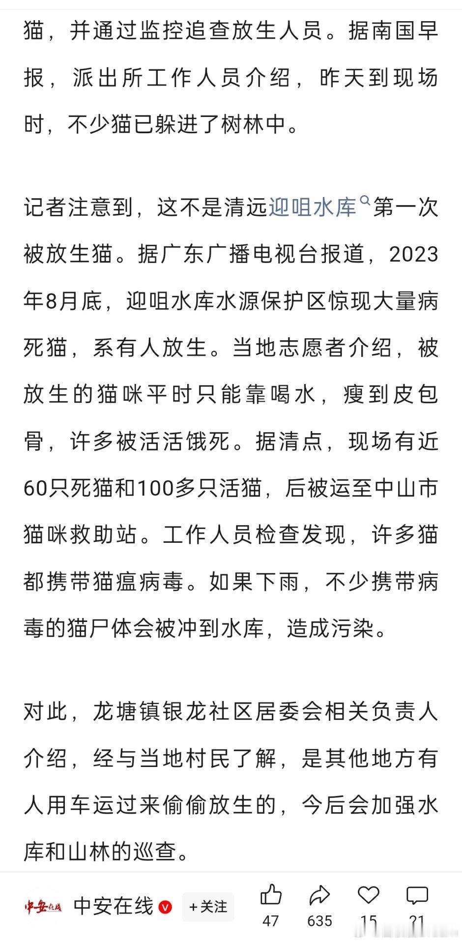 🔻广东清远一水库边被放生大量猫,目击者称已救起3只。当地志愿者介绍,被放生的猫咪平时只能靠喝水,瘦到皮包骨。据清点,现场有近60只死猫和100多只活猫。工作人员检查发现,许多猫都携带猫瘟病毒。
