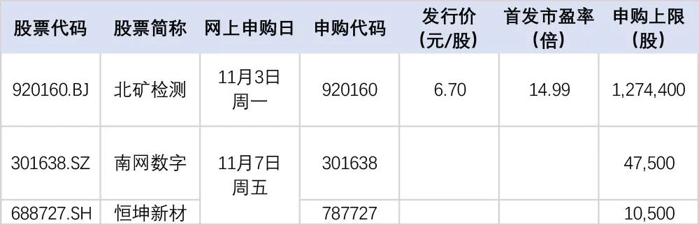 据目前安排,若无变化,下周(11月3日至7日)有3只新股可申购,分别为科创板1只、创业板1只和北交所1只。