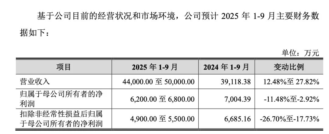 恒坤新材招股书称,预计公司2025年前三季度实现净利润6200万元至6800万元,同比变动-11.48%至-2.92%。