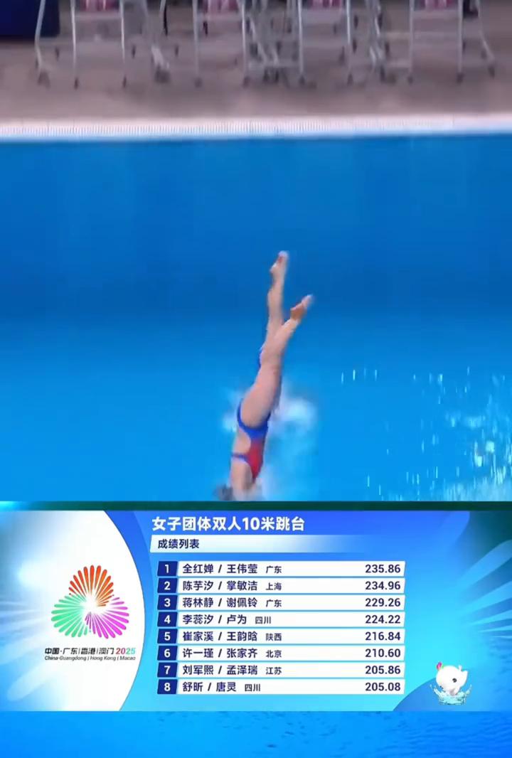 全红蝉十五运首金,跳水女团广东队夺冠。 还是挺漂亮的,大家可以看到她从侧面可以的,真棒。在有一段时间没出来参加比赛之后,本身这个动作的掌控,漂亮。虽然整体看拳头拳的身材会有一些变化,但是并没有影响到她今天的正常竞技水平的发挥。