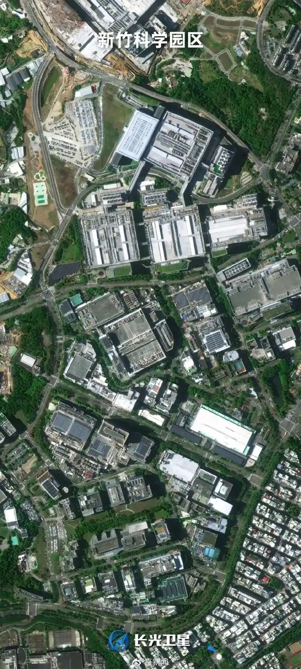 卫星视角下,日月潭“日轮”与“月钩”的形态,阿里山大片绵延起伏的森林,台北市的城市脉络与道路网格,台北港营运码头的集装箱,中正纪念堂两厅院的屋顶,鹅銮鼻半岛鲜明海岸线和白色灯塔,以及台湾半导体产业核心新竹科学园区密集的厂房建筑等都清晰可见。