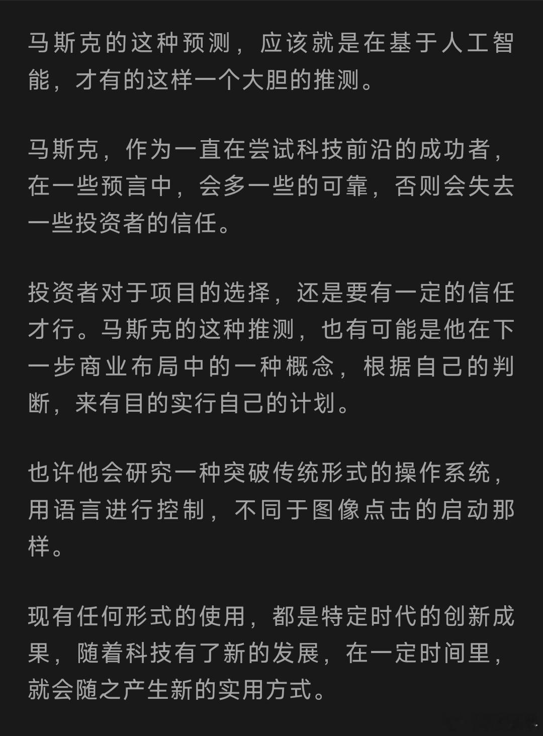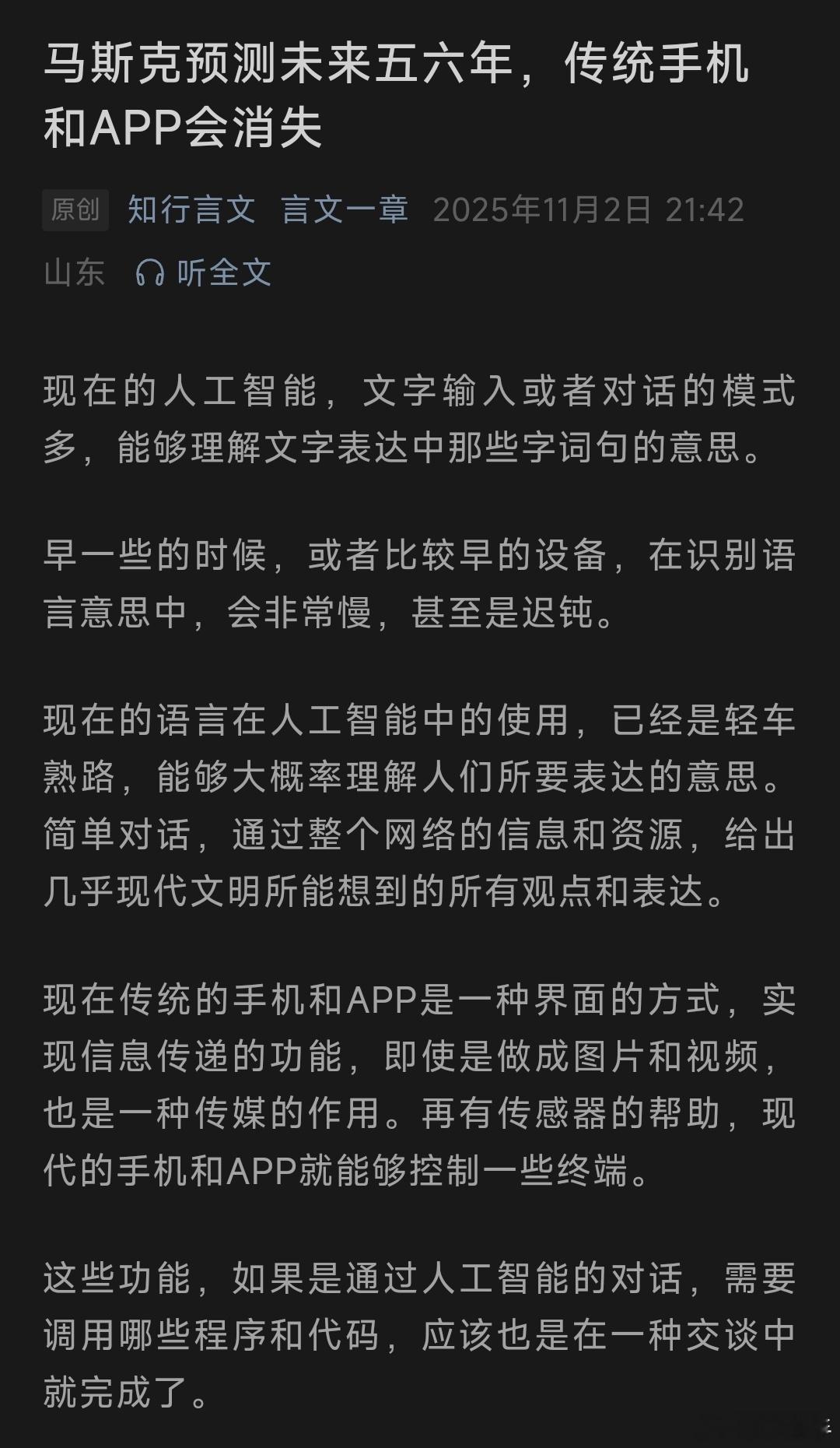 马斯克预测未来五六年,传统手机和APP会消失现在的人工智能,文字输入或者对话的模