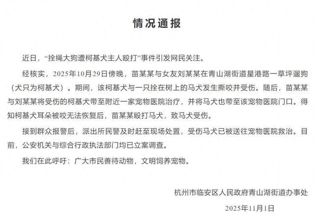 昨天,浙江省杭州市临安区人民政府青山湖街道办事处就“拴绳大狗遭柯基犬主人殴打”事件发布情况通报。
