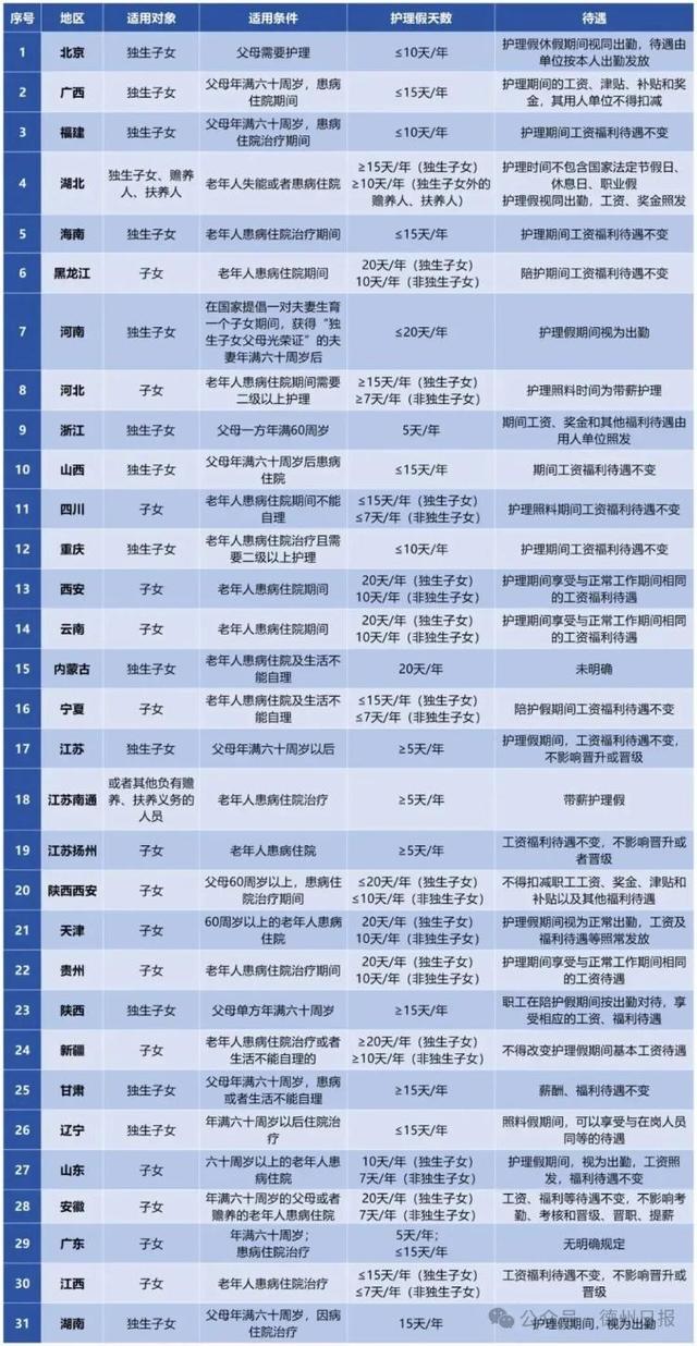 父母护理假并非强制假期。虽然多地已经出台相关法规,将父母护理假纳入了法定假期范畴,但具体实施情况因地区、单位而异。具体见下表: