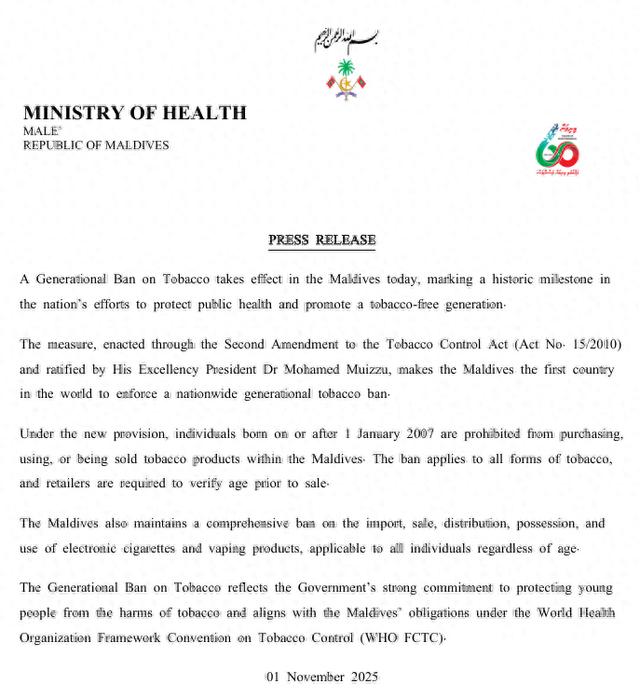 据新华社报道,马尔代夫卫生部11月1日宣布,当天起对出生于2007年1月1日及以后的人员实施“世代禁烟令”,禁令适用范围包括外国游客。