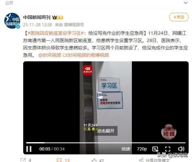 近日,一小红书网友发帖调侃“我们对学习的热情高到发烧”。 他晒出,某医院给儿童设立了 「学生输液(临时学习区)」 ,并配上英语标语“Make use of time, go to bed early”,甚至给雾化区也设定了学习角。 有网友称这应该是中国特色,不知道国外有没有这种情况。