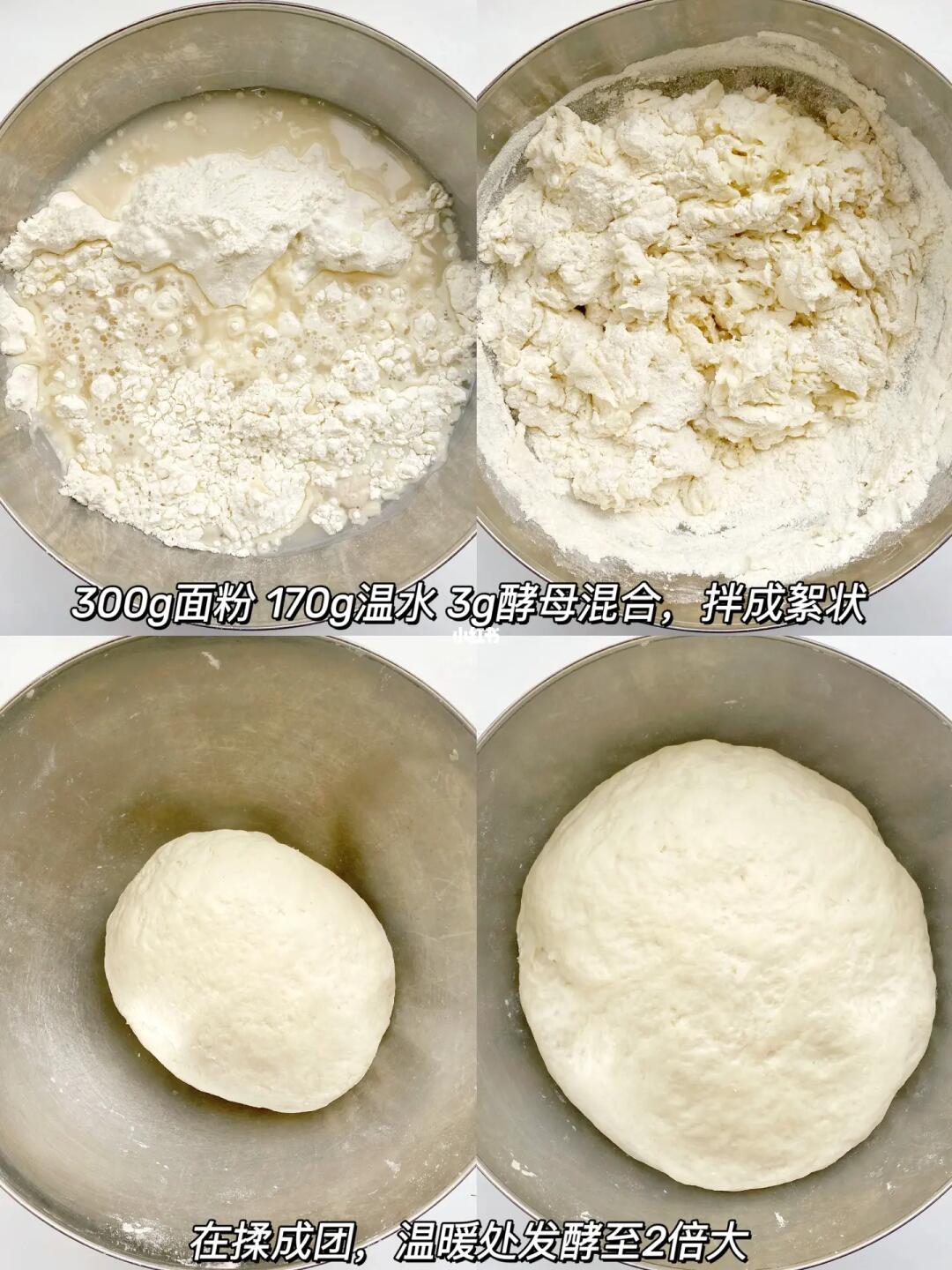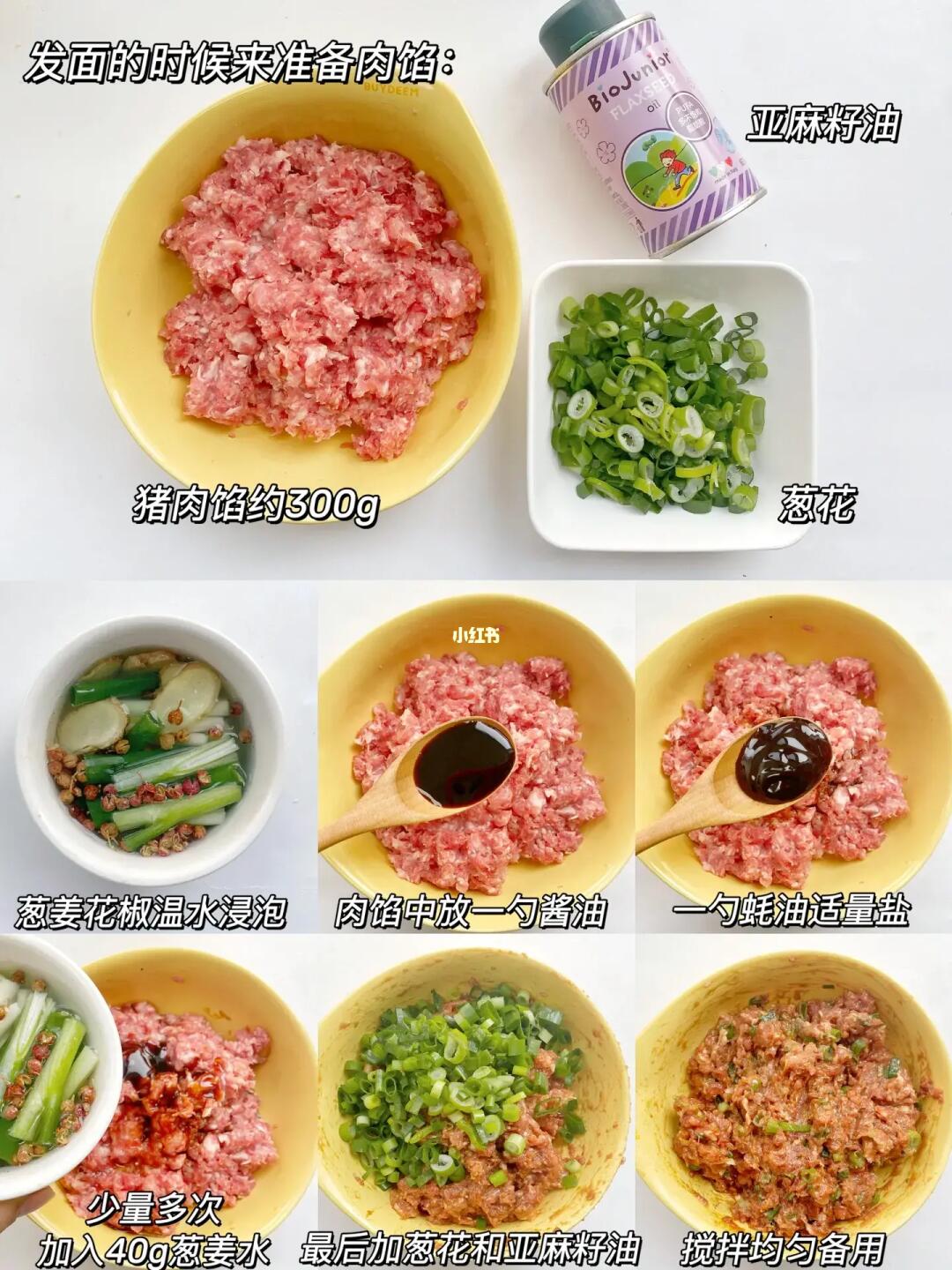 1⃣️面粉、清水、酵母混合先拌成絮状,再揉成团温暖处发酵至2倍大。发面的时候来准备包子馅。