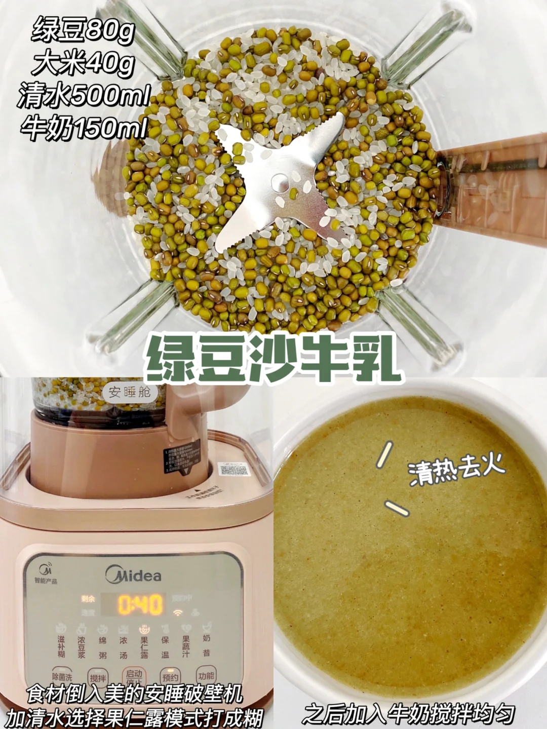 绿豆80g、大米40g、清水500ml、牛奶150ml
