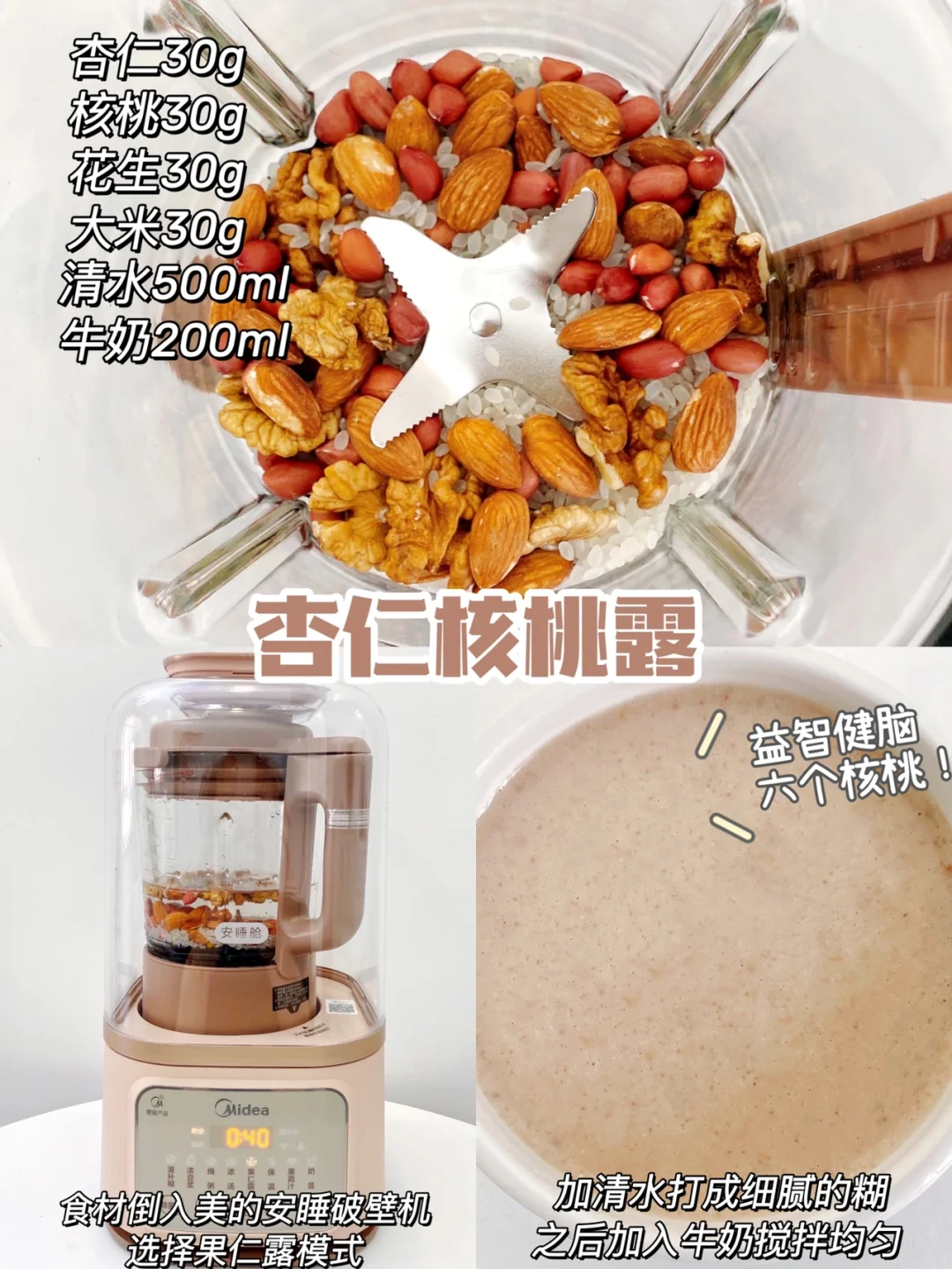 杏仁30g、核桃30g、花生30g、大米30g、清水500ml、牛奶200ml