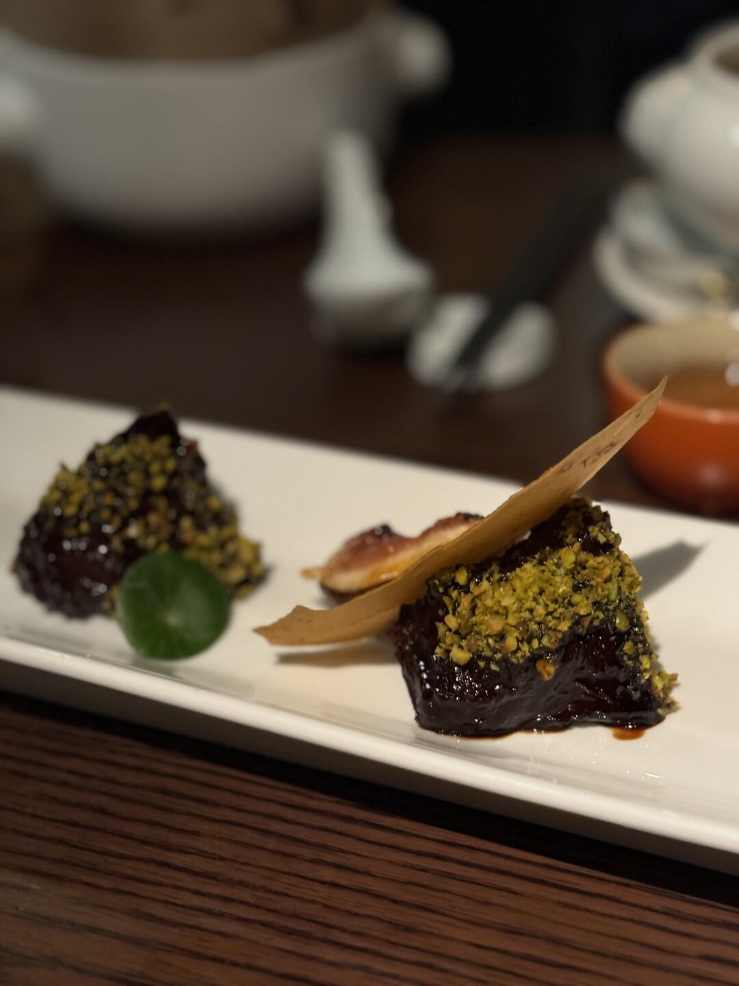 🥢主食:今天选的是牛脸肉🥩很不错,入口很容易嚼,还有另一道鱼子酱烤鸭 做法很精致,下面有一个懦弱的软糯米很好吃