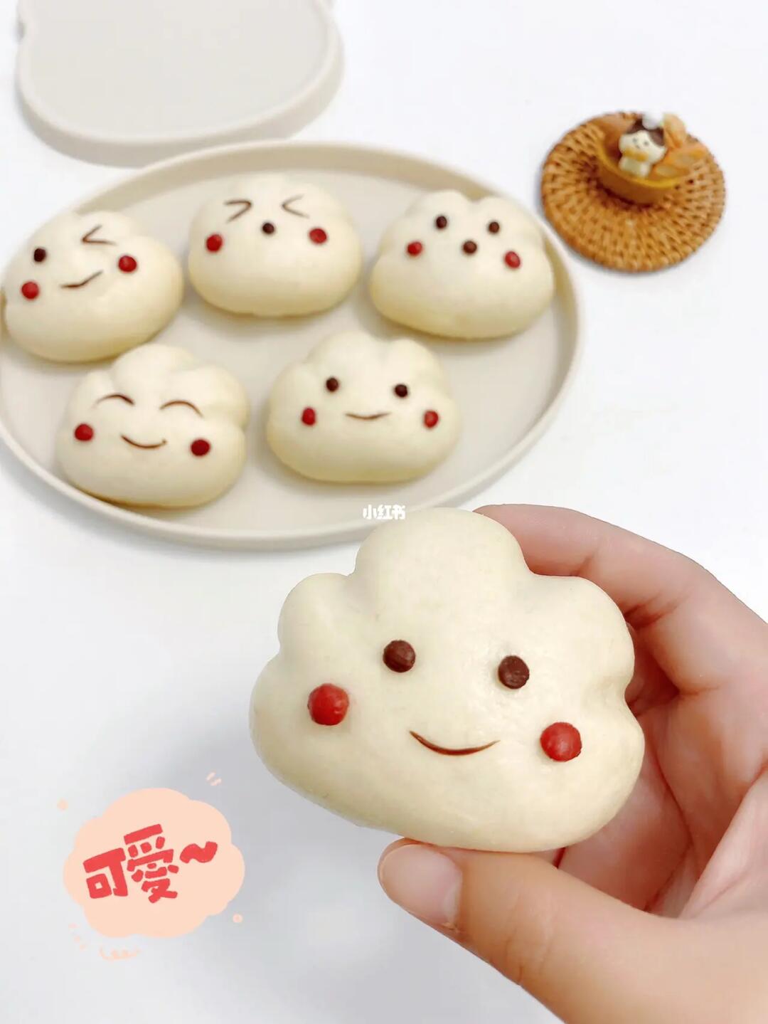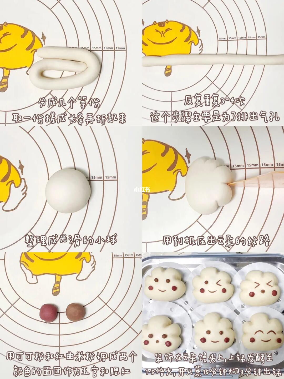 4⃣️留一小块面团加可可粉和红曲米粉调色作为表情和腮红,装饰在云朵馒头上。