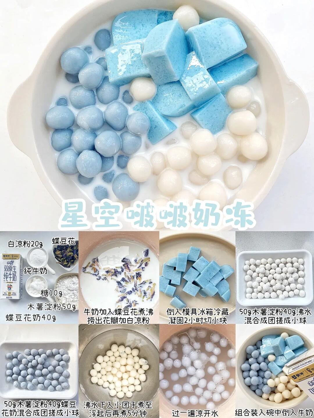 ▫️蓝色啵啵:蝶豆花牛奶40g、木薯淀粉50g、糖10g