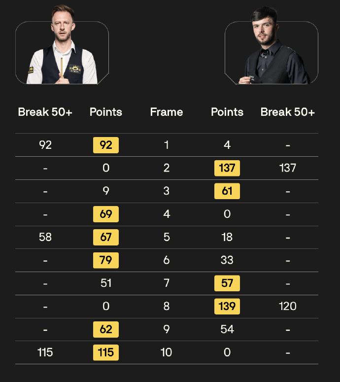 特鲁姆普在4-2领先时一度被追平,随后他连下两局拿下比赛;全场他打出一杆破百(115)和两杆50+(92、58),埃莫里打出两杆破百(137、120)。