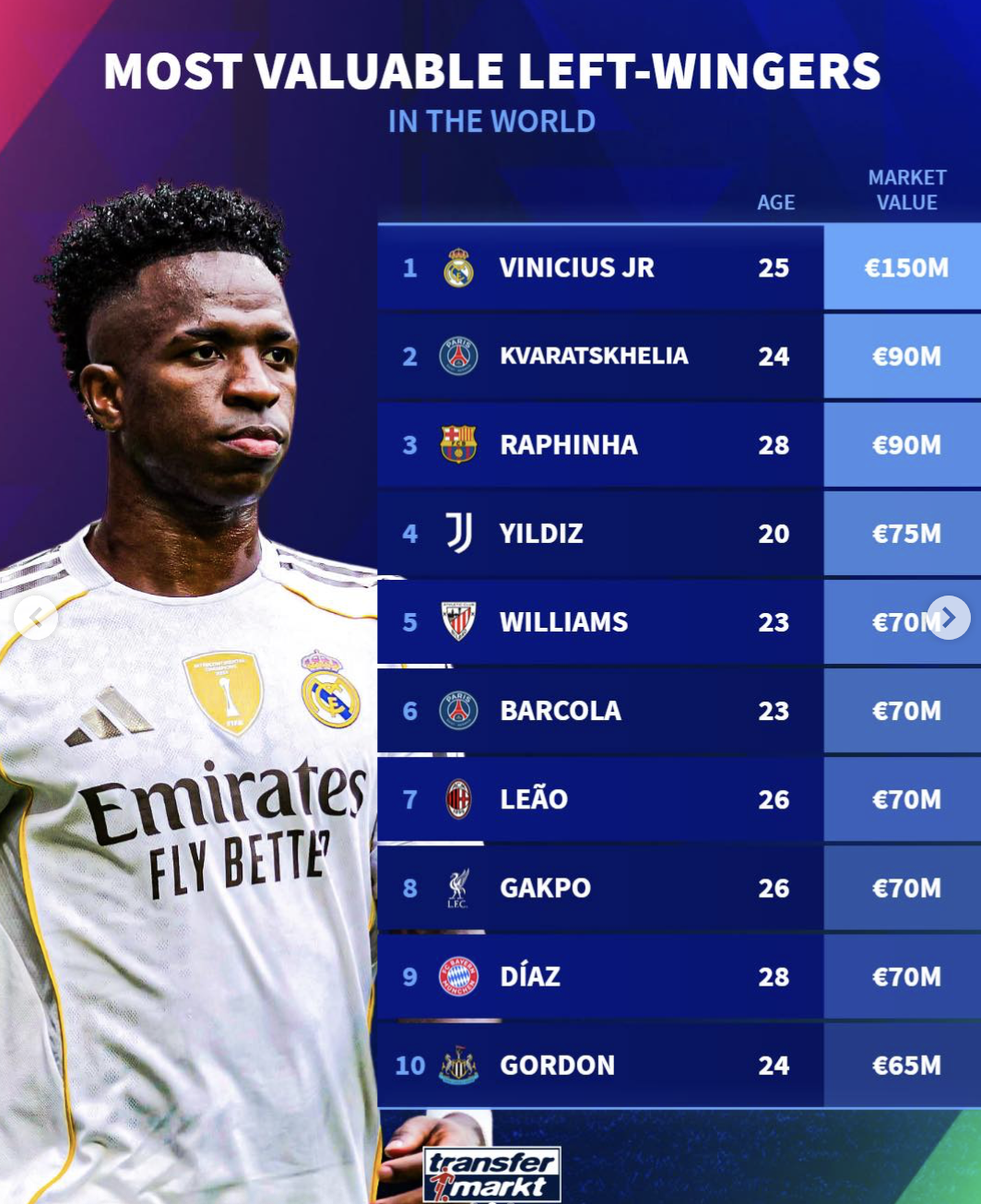 皇马的维尼修斯以1.5亿欧居首,巴黎圣日尔曼的克瓦拉兹赫利亚和巴萨的拉菲尼亚以9000万欧并列第二。