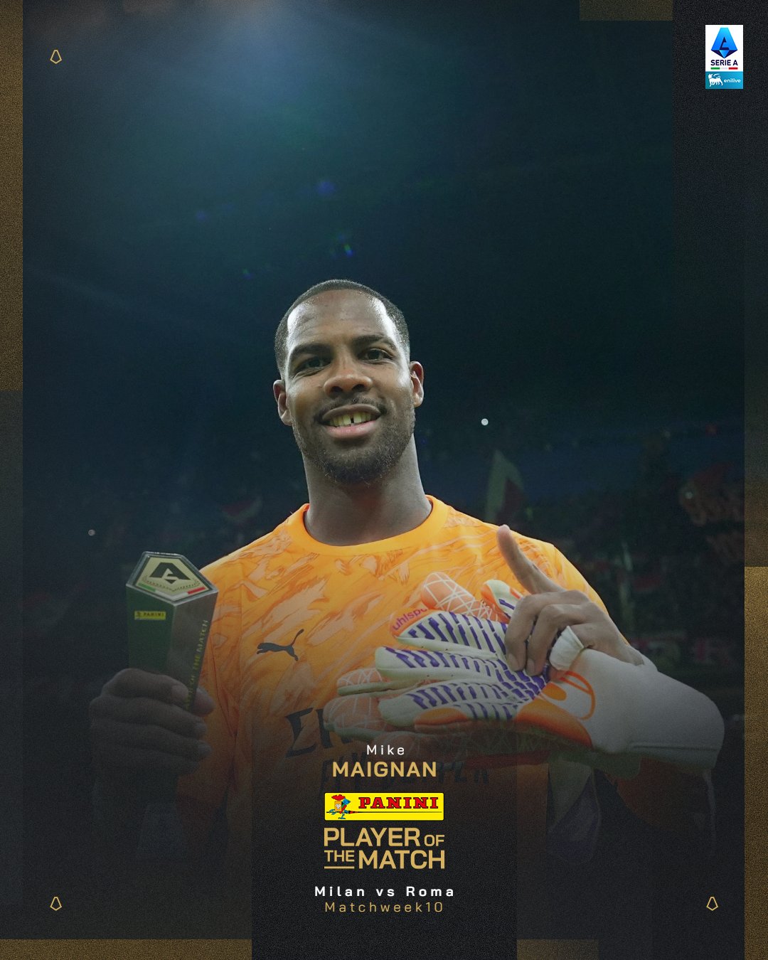 意甲官方:迈尼昂当选AC米兰1-0罗马全场最佳球员