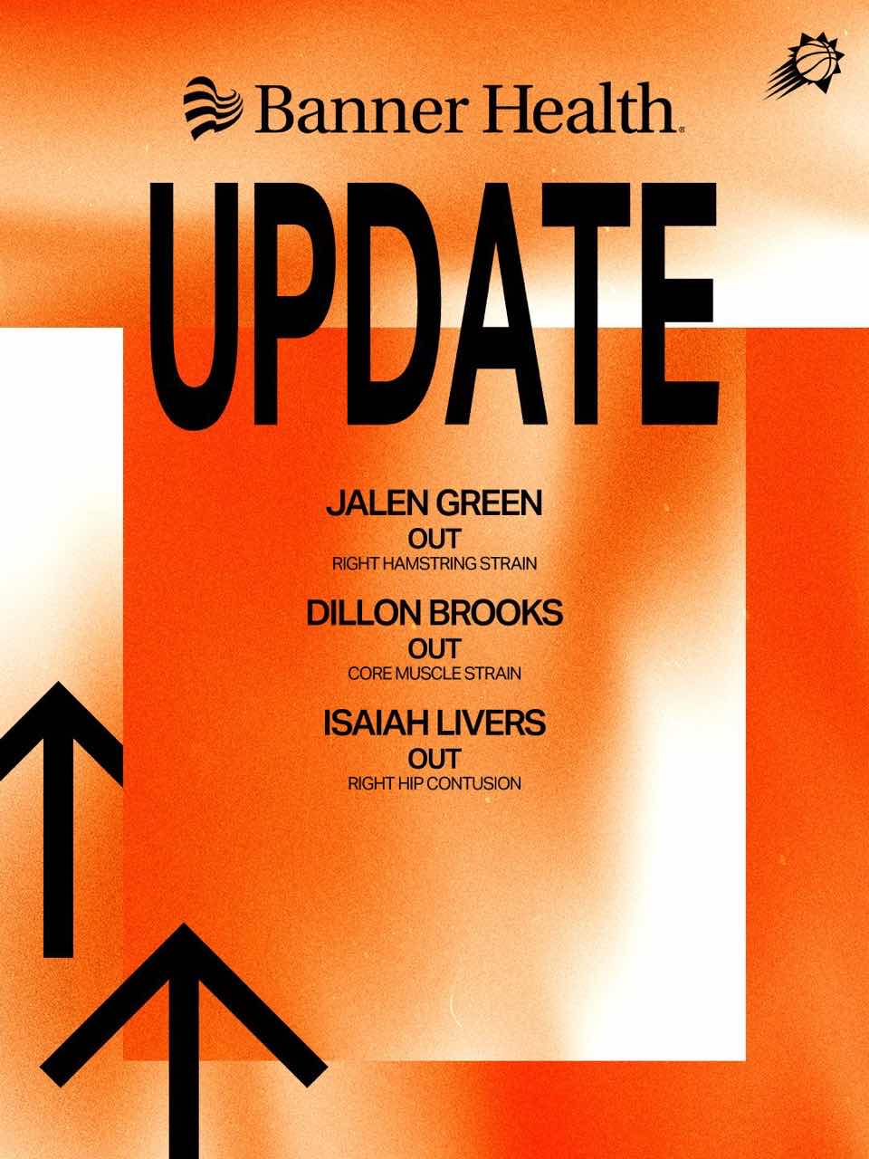 太阳赛前公布本场伤病报告:杰伦-格林&狄龙-布鲁克斯&以赛亚-利弗斯将缺席今日比赛。