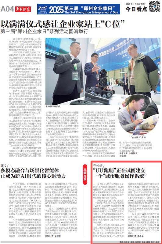 11月1日,第三届“郑州企业家日”系列活动主题演讲环节,UU跑腿创始人、董事长乔松涛以生成式AI重构即时配送产业生态为主题分享了AI技术对企业发展和产品应用带来的创新与变革。
