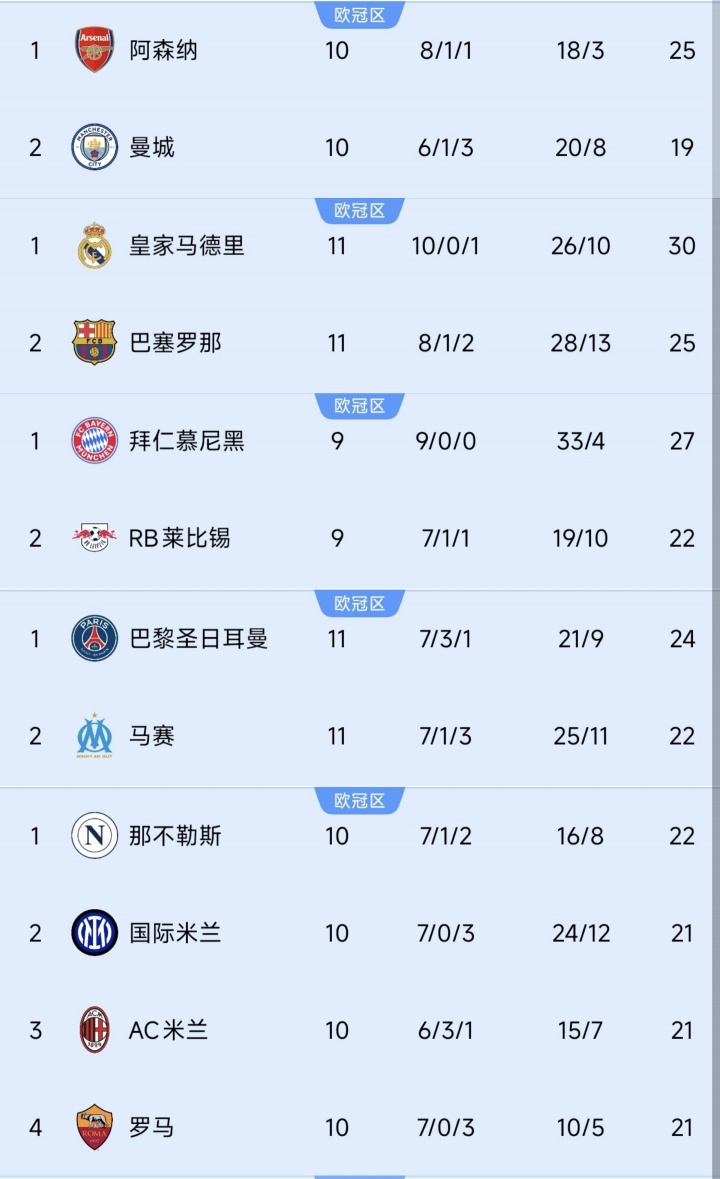 目前领跑优势最大的是英超的阿森纳,他们领先第2曼城6分。西甲的皇马和德甲的拜仁均有5分的优势,第2分别是巴萨和莱比锡。法甲的巴黎2分领跑,本赛季他们状态一般。意甲是领跑优势最小的联赛,甚至他们的前四都只差1分:那不勒斯1分优势,力压米兰双雄和罗马。