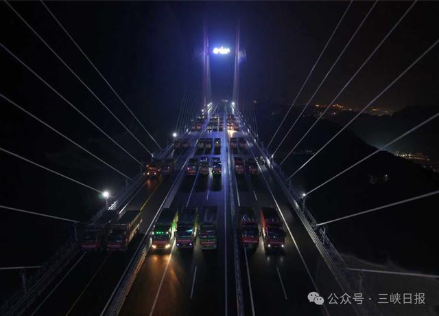 荷载试验是桥梁通车前的“终极体检”,通过模拟各种行车状态,检验桥梁结构的安全性能和承载能力。柴埠溪特大桥荷载试验以“全面覆盖、精准采集、严苛标准”为原则,构建了成桥状态测试、静载试验、动载试验三大测试体系。在静载试验中,19个测试工况层层递进,35吨级三轴载重车组成的重载车队轮番上阵,单次最大投入49台车辆形成1715吨的极限荷载,相当于300头成年大象的总重量。