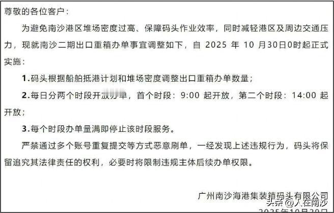 【突然!南沙港区实施有限制地控制办单】10月25日,万海旗下集装箱船“曦春轮”和散货船“海力5轮”在珠江口伶仃航道水域发生碰撞。这个事故导致南沙港航道有影响。 10月29日,广州市南沙区龙穴街道预联办发布提示:由于海运航道上有事务在处理中,致使南沙港区停靠的船舶有所限制。从2025年10月30日零时起,南沙港区实施有限制地控制办单。请各企业及货运公司安排好所属的车辆没有成功预约的切勿前往港区; 从码头通知可以看到,南沙二期的办单时间仅分两个时段开放。首个时段:9:00起开放,第二个时段:14:00起开放;每个时段办单量满即停止该时段服务。而南沙三期,10月30日起每日分三个时段开放办单,首个时段9:00起开放、第二个时段12:00 起开放、第三个时段15:00起开放。号满即停。 希望这次航道影响可以尽快解决吧,毕竟南沙港今年以来出入货量一直在不断的增长中,今年还剩下两个月,还是可以继续冲一波量的。可不要让这次的事件给影响了。