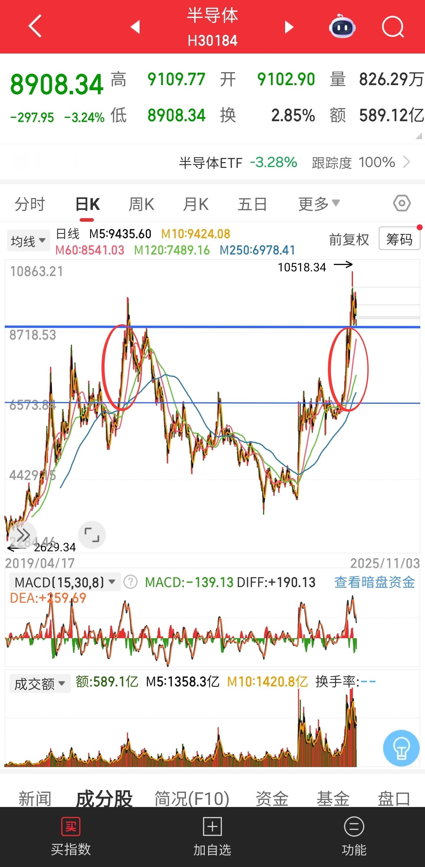 回踩阶段,相较于四年前突破8880仅两周就回落,这次的半导体还是相当强的,目前依然是历史最强状态的半导体。