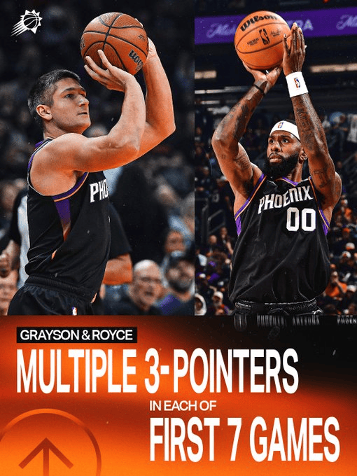赛后,据太阳官方消息,队史赛季前7场比赛三分球命中数排行榜: