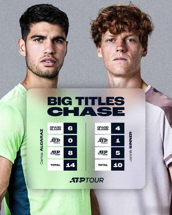 ATP官方对比了辛纳、阿尔卡拉斯两人重大冠军数量对比,辛纳在年终领先,在大满贯、大师赛方面落后阿尔卡拉斯。